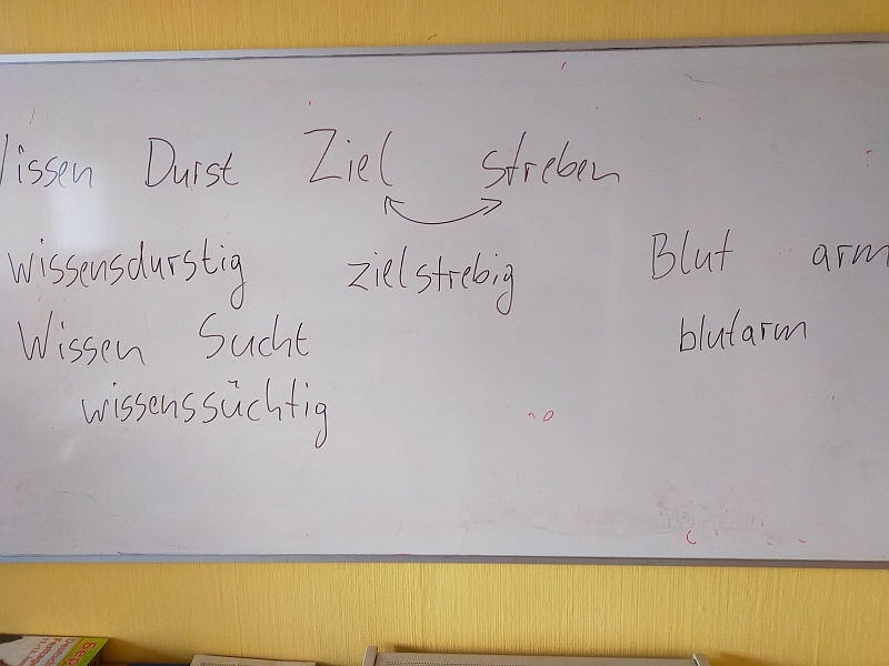 Heute ging es darum, das Hörverständnis zu verbessern. Deshalb wurden zwei Texte vorgelesen: ein Text zum Duzen und Siezen und ein Text zu deutschen Lehnwörtern in der russischen Sprache. Wir haben besprochen, was verstanden wurde. Dann sind wir eine Liste deutscher Wörter durchgegangen, die ins Russische übernommen wurden. Wir haben darüber diskutiert, ob diese Wörter bekannt sind und ob sie in der normalen Sprache gebräuchlich sind bzw. ob überhaupt bekannt ist, dass die Wörter einen deutschen Ursprung haben.