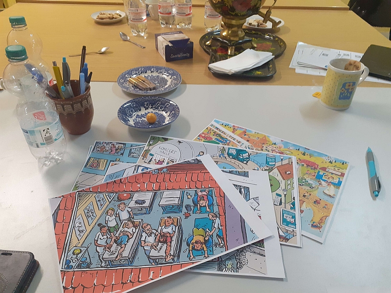 Heute haben wir Sprachkarten ausgedruckt und ein paar Varianten vorgestellt, was man damit machen kann. Die Teilnehmer haben sich für die Variante entschieden, dass jeder eine Karte aus einem Karton zieht und einen Satz zu dem Wort oder Bild auf der Karte sagt. So erzählen wir zusammen eine Geschichte. Das hat ganz gut funktioniert und es waren ein paar Wörter oder Sätze dabei, die für die meisten neu waren. Da in der Geschichte die Männer immer wieder Bier getrunken und Fußball geschaut haben und die Frauen geputzt und sich geschminkt haben, gab es auch einiges zu Lachen.