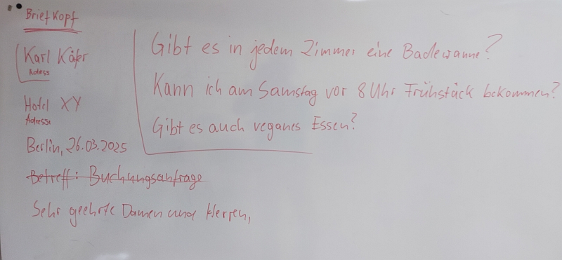 Es wurde weiter besprochen, wie ein offizieller Briefkopf aussieht, wie die Personen in Schreiben oder Mails angesprochen werden können (förmlich bei Unbekannten oder Chefs und in Briefen, persönlicher bei Mails oder Bekannten).